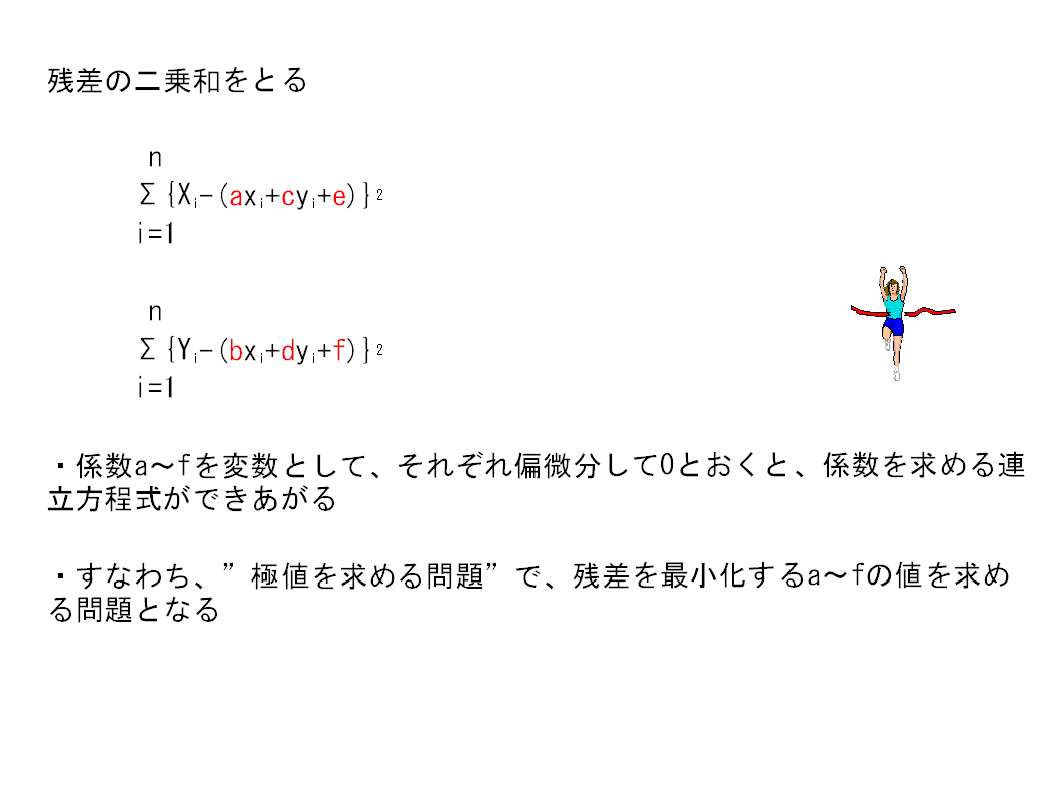・GCPの組み合わせを用いて、画像座標から地図座標に変換する式を最小自乗法で求めます。