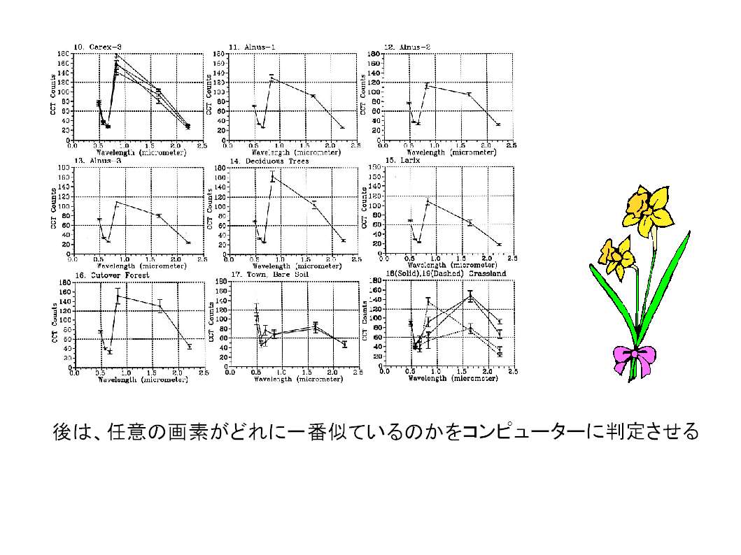 ・こうなると、スペクトルあるいは分光反射率がわかった任意の画素を、実際の対象と関連付けることができるようになります。 |
