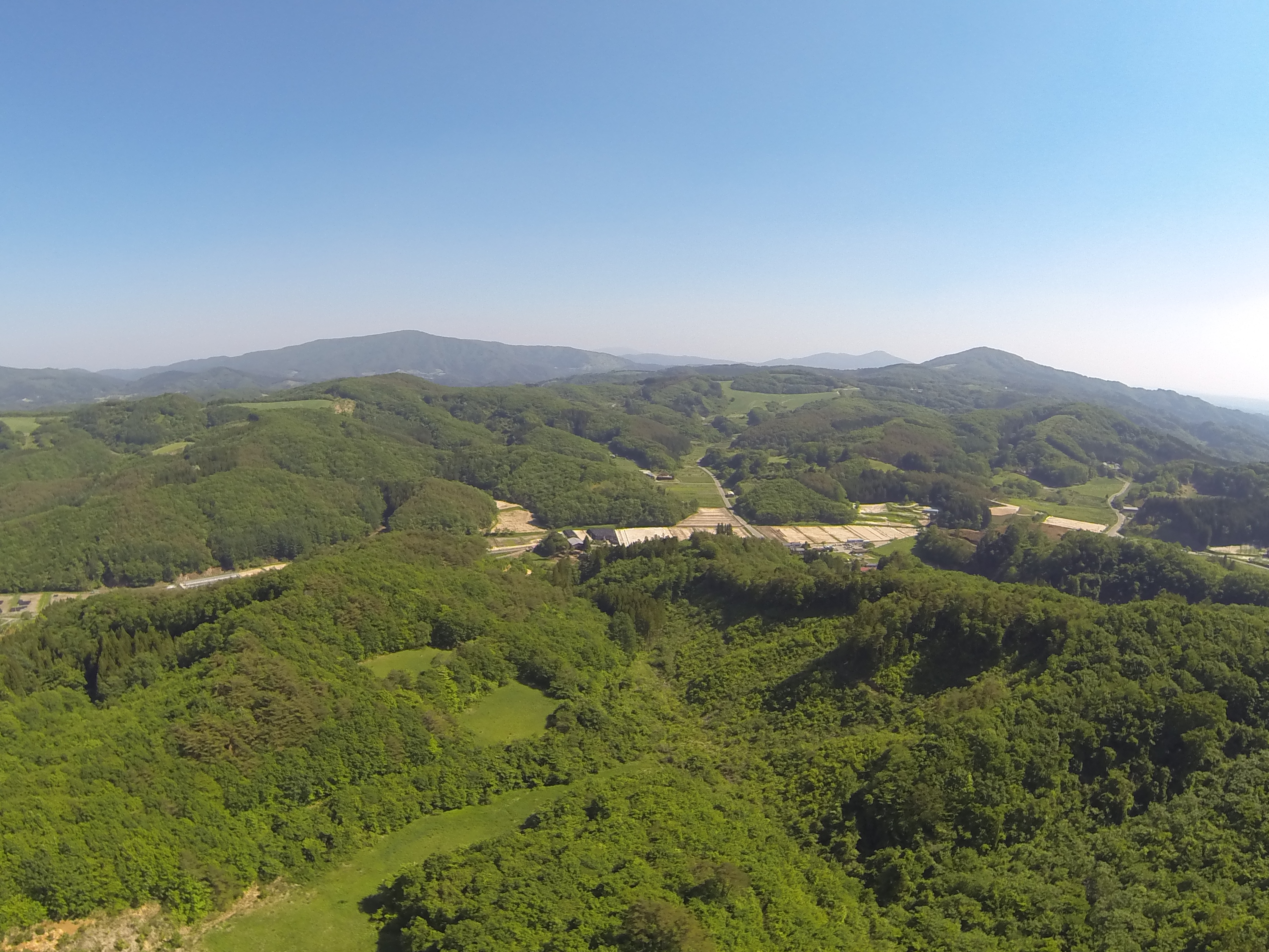 植生は何でしょう。初夏の写真なのでわかりにくいかも知れませんが、落葉広葉樹です。落葉広葉樹は宮沢賢治の童話にも登場する東北地方の自然植生です。良く見ると伐採されているところもあり、作業道も見え、落葉広葉樹林が高度に利用されていることもわかります。それは里山としての新しい平衡状態といえます。